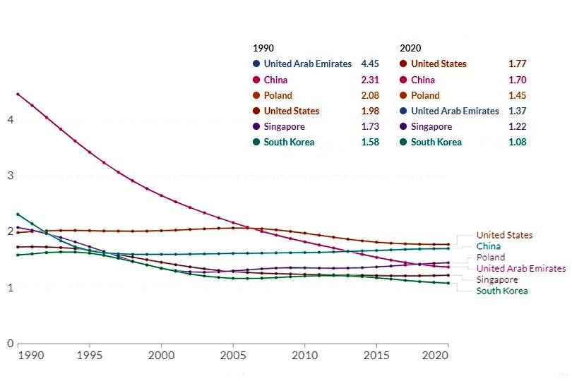 En la República de Corea, la situación no es mejor. Entonces, en 2020, Corea del Sur, por primera vez en la historia, informó una disminución de la población. La tasa de fertilidad total del país alcanzó un mínimo histórico de 0,84 en 2020. Los políticos han advertido que el país podría enfrentar un shock demográfico a partir de 2030-2040 como resultado de la disminución de la población y el envejecimiento social si no resuelve los problemas demográficos de manera oportuna.